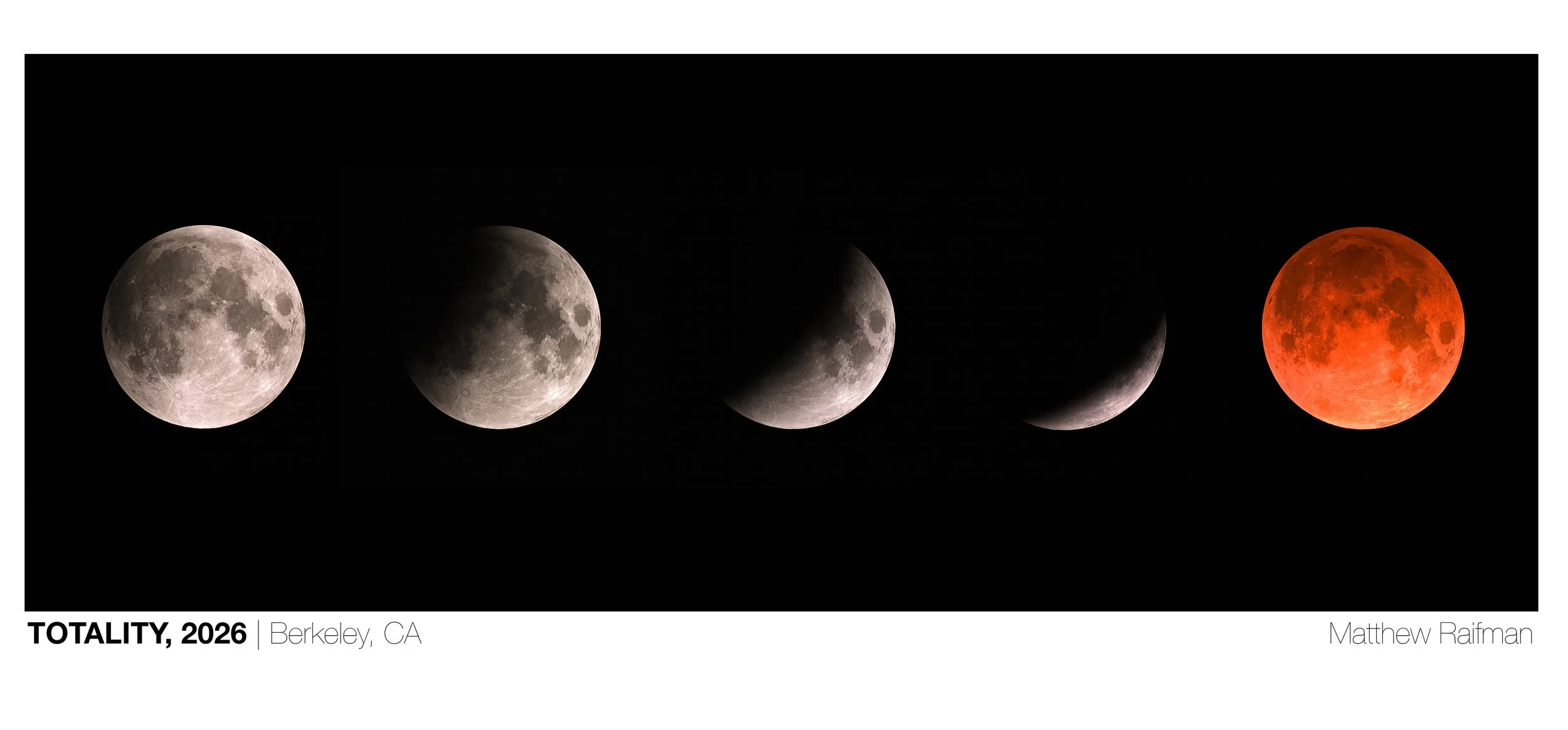 From 1:30am-3:30am in my Berkeley backyard, I captured over 250 images to create this composite photograph documenting the progression of the moon toward totality.